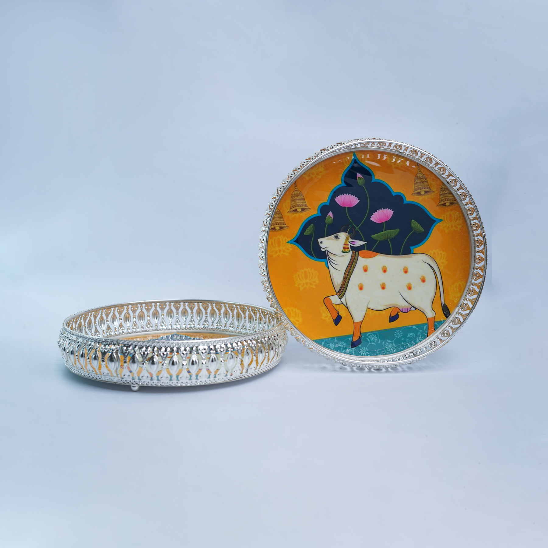 This 8-inch silver finish tray features an exquisite Pichwai print, showcasing India’s rich artistic heritage.