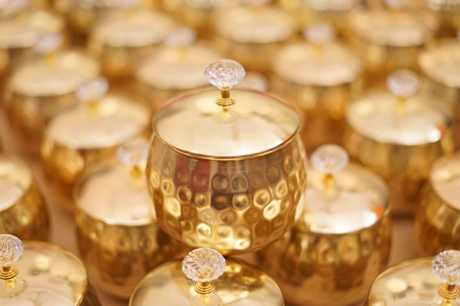 A beautifully crafted 5-inch golden pot jar, perfect for return gifting.